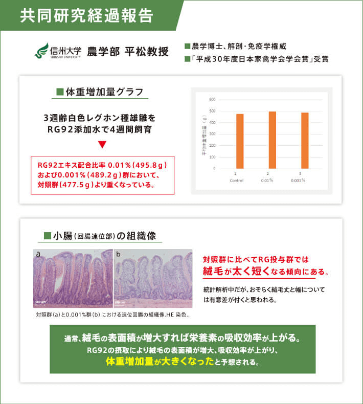 養鶏への温藻RG92の投与試験は、大手商社や養鶏企業とも共同で行われ、いずれも平均体重のアップを確認しました。